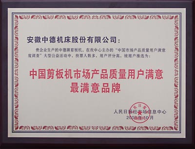 由人民日報社市場信息中心主辦、中國物流與采購聯(lián)合會、中國紡織工業(yè)協(xié)會、中國輕工機械協(xié)會等60多家權威行業(yè)協(xié)會、《工人日報》、《科技日報》等10家權威報刊、人民網及搜狐網等權威網站協(xié)辦支持,為期三個多月的“中國市場質量用戶滿意度調查”大型公益活動終于揭曉。我公司生產的中德牌剪板機,在本次公益活動中,投票人數(shù)多,用戶評分高,被用戶推選為:中國剪板機市場產品質量用戶滿意最滿意品牌。