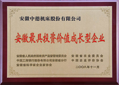 能夠進入2008年安徽最具投資價值企業的評估百強,是對企業各個方面的能力的權威肯定,因為評價結果將為各級政府決策提供參考依據,為金融機構、融資機構的企業信貸決策提供參考依據,為企業充分展示自身的成長能力、投資價值和戰略合作伙伴提供機會。此次進入“2008安徽最具投資價值成長型企業百強榜”對于中德機床來說,意義深遠。中德將在技術創新,開辟廣闊市場方面做進一步的努力。