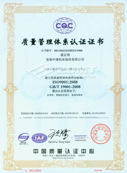 2010年4月,我公司順利通過(guò)了ISO 9001:2008版換證復(fù)審,獲得認(rèn)證證書(證書編號(hào):00110Q23628R2S/3400)。在此次復(fù)審過(guò)程中,中國(guó)質(zhì)量認(rèn)證中心(CQC)對(duì)我公司的質(zhì)量體系運(yùn)行情況進(jìn)行了全方位嚴(yán)格審核,并對(duì)中德公司質(zhì)量管理工作給予了充分的肯定。